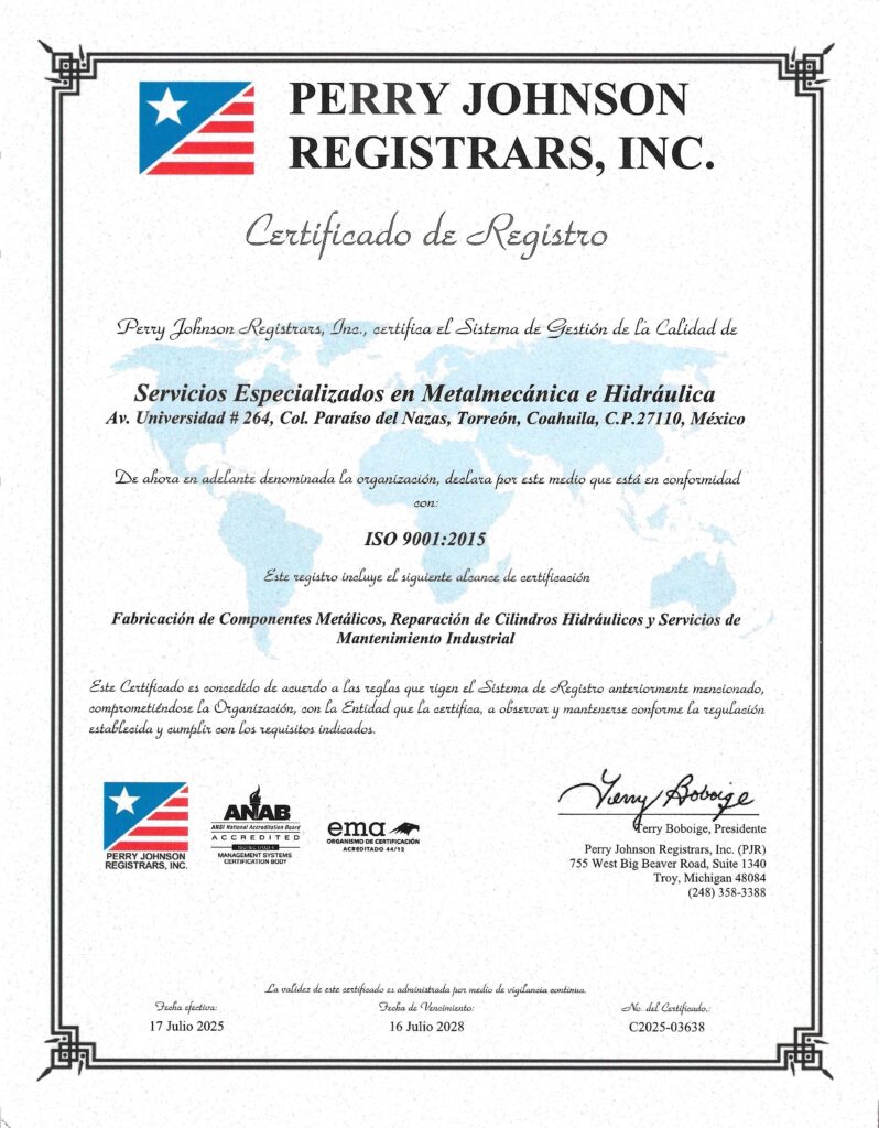 En SEMSA, la calidad es nuestra prioridad. Nos dedicamos a ofrecer servicios de fabricación y reparación que cumplen con los más altos estándares de la industria. Nuestra certificación ISO 9001 es un testimonio de nuestro compromiso constante con la excelencia y la mejora continua.